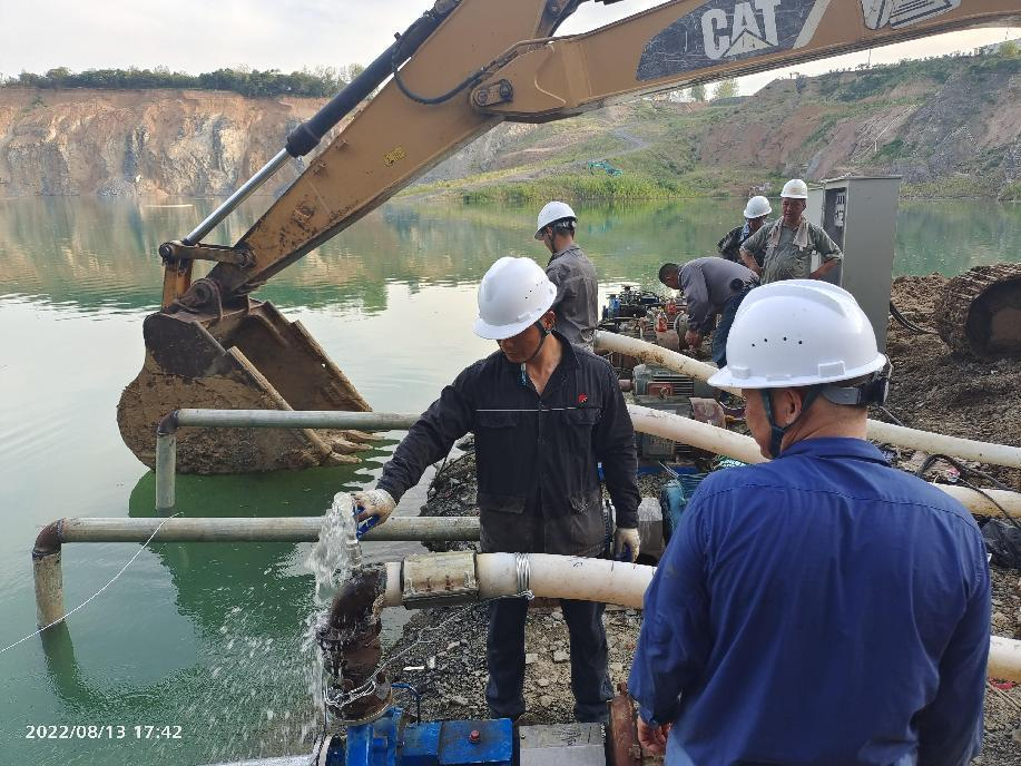 “以前的舊水泵很多都不能工作了需要大修,配電箱需要重新組裝,取水鋼管需要改造升級……”抗旱突擊隊隊長周理昌針對遇到的難題提出了工作建議,可是面對十幾臺水泵的維修安裝任務(wù),興天礦業(yè)和社區(qū)人手特別是技術(shù)人員明顯不足。為加快安裝進(jìn)度,興天礦業(yè)緊急向同屬滁州市礦投集團(tuán)的銅鑫礦業(yè)和瑯琊山工程技術(shù)公司申請支援,很快8名具有地下400多米抽水工作經(jīng)驗的技術(shù)員馳援天長,立即投入抗旱戰(zhàn)斗。每天早上4點(diǎn)多起床,5點(diǎn)鐘到達(dá)現(xiàn)場,頂著40℃左右的高溫,為防止曬傷還要穿著長袖,衣服濕了一遍又一遍,晚上的蚊蟲一群又一群,安裝過程中遇到的問題一個又一個,再苦再累,都難不倒這群已經(jīng)五十多歲的鋼鐵漢子,只要下到礦坑里,每個人就是抗旱突擊隊的一員,敢挑重?fù)?dān)、敢打硬仗是幾十年塑造的國企精神,加班加點(diǎn)、日夜奮戰(zhàn)展現(xiàn)的是為民服務(wù)的國企擔(dān)當(dāng)。連續(xù)的高溫作業(yè),突擊隊員和社區(qū)干部群眾很多人都中了暑,礦坑內(nèi)沒有地方避暑,在臨時支起來的遮陽網(wǎng)下稍作休息,只要能堅持就重新返回工作崗位,他們都是最可敬最可愛的人。