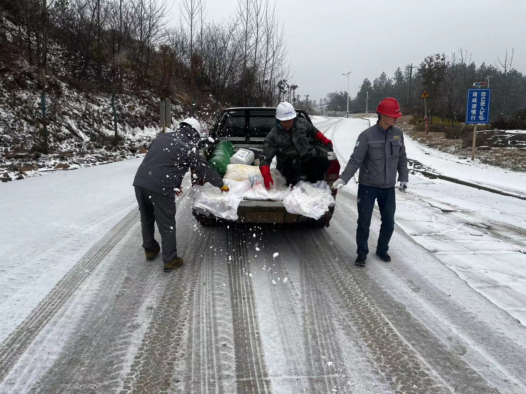 根據(jù)實(shí)時(shí)天氣變化和道路狀況,興全礦業(yè)提前做好詳細(xì)的融雪防滑預(yù)案和應(yīng)急物資準(zhǔn)備,第一時(shí)間安排人員至運(yùn)輸?shù)缆窉伻鋈谘﹦?,組織人工鏟雪,防止道路結(jié)冰,保障運(yùn)輸安全。